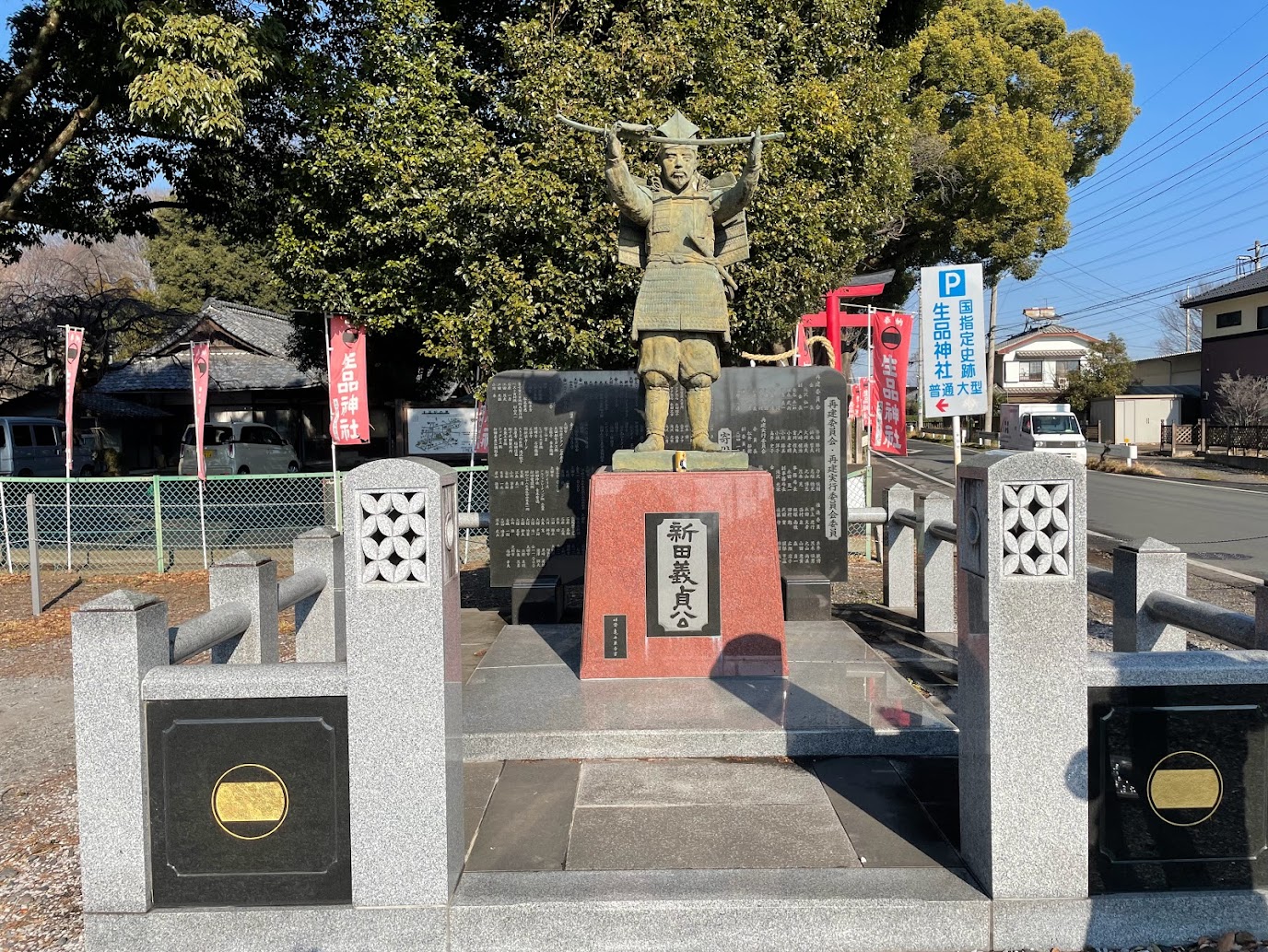 (写真下:「生品神社」前に2012年5月に再建された「新田義貞公銅像」(群馬県太田市新田市野井町)<*2021年12月25日午前訪問撮影>