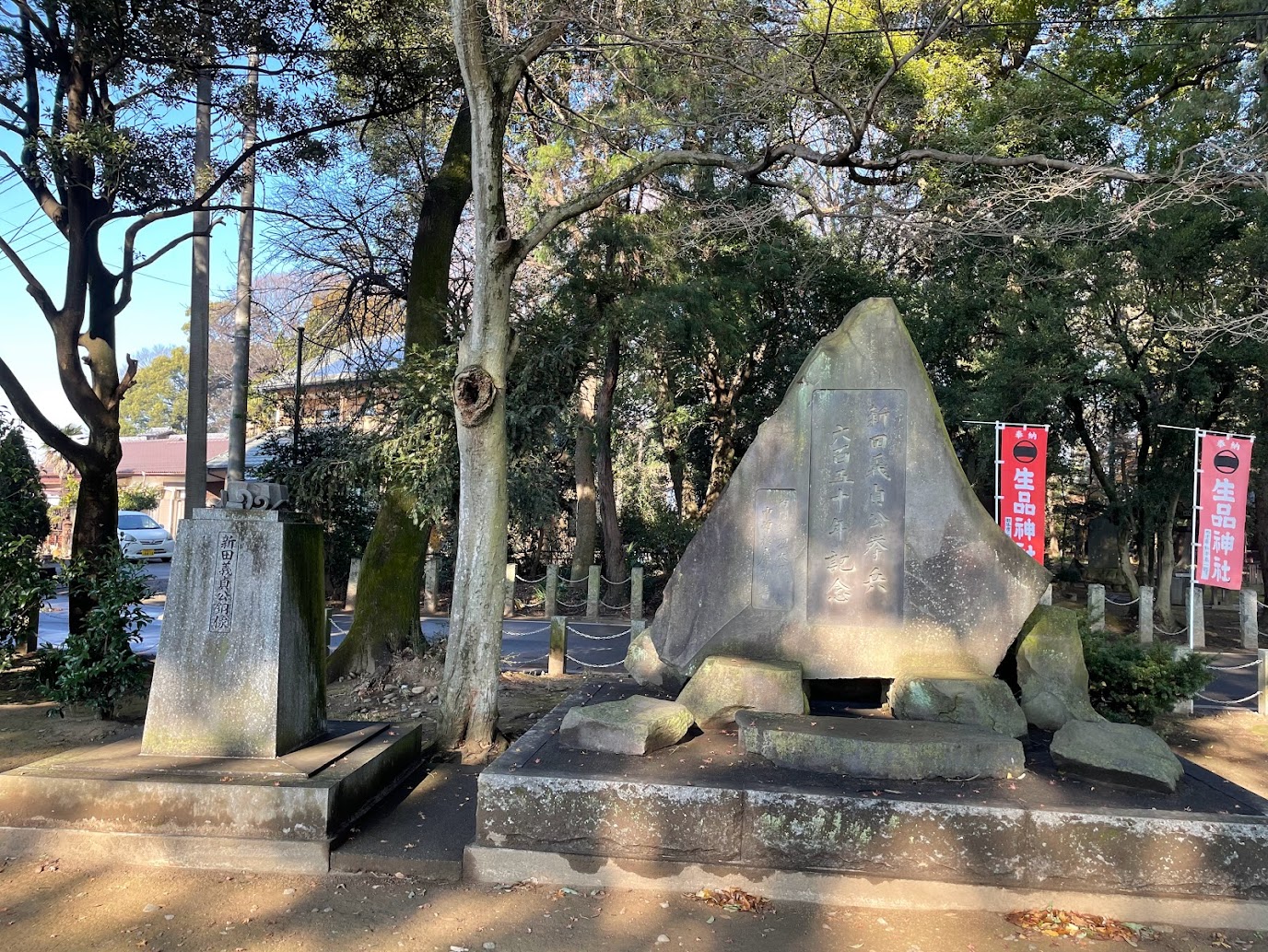 生品神社境内(元・群馬県新田郡新田町市野井、現・群馬県太田市新田市野井町)は、昭和9年(1934年)3月13日、建武の中興6百年を記念して「生品神社境内 新田義貞挙兵伝説地」として国の史跡に指定されたが、平成12年(2000年)11月1日、「新田荘遺跡  生品神社境内」として、面積を広げて国の史跡に指定されている。神社境内には、旗挙げ塚、床几塚、記念碑などがあり、義貞が旗挙げの時に軍旗を掲げたと伝えられるクヌギの古木は、明治37年(1904年)6月9日に倒れ、幹の一部が拝殿前に保存されている。なお、生品神社の境内内にもともと安置されていた、海中に太刀を投じる姿の新田義貞公の銅像は、1941年に義貞公を慕う地元小学校の教師と児童たちが勤労活動によって集めたお金を元にして建立されたもので、1983年の挙兵650年を機に生品神社の境内に安置されていたもの。ところが、2010年2月、この生品神社の境内に安置されていた新田義貞公の銅像が何者かによって盗まれてしまい、2011年に地元の有志の方々を中心に「新田義貞公銅像再建委員会」が発足し、生品神社前に再建され、2012年5月8日、義貞公銅像除幕式が行われた。新たな銅像の製作者は、彫刻家の脇谷幸正 氏で、新田義貞の弟・脇屋義助の24代目子孫にあたる方とのこと。