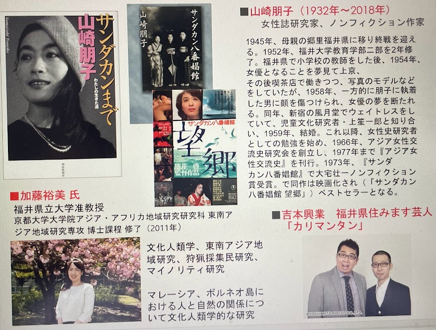 (写真上)東マレーシアのサンダカンについて説明中。福井県ゆかりのノンフィクション作家、山崎朋子さんの「サンダカン八番娼館」等も紹介