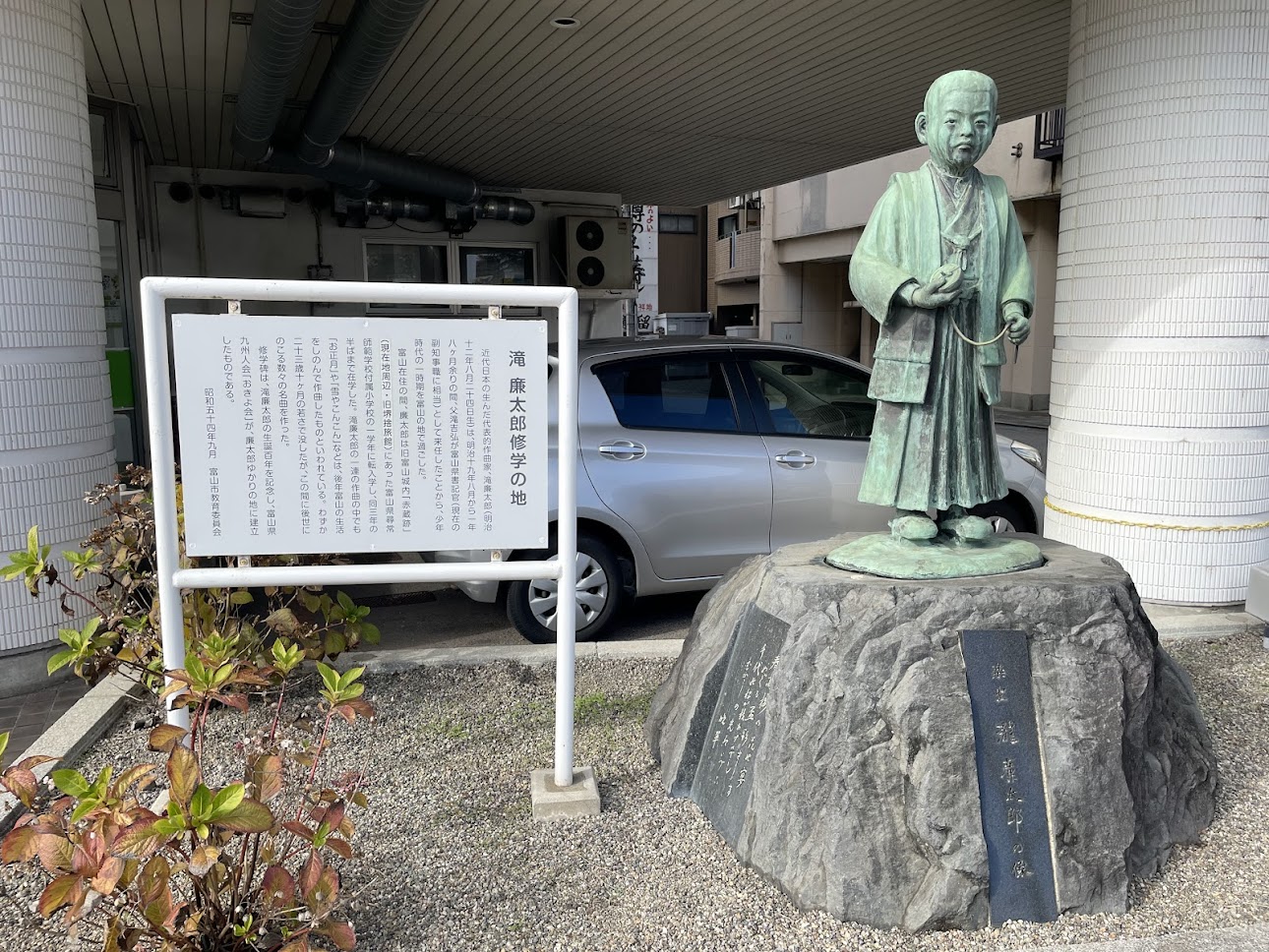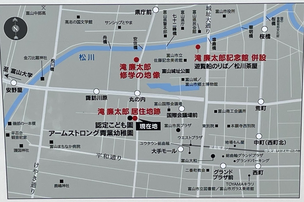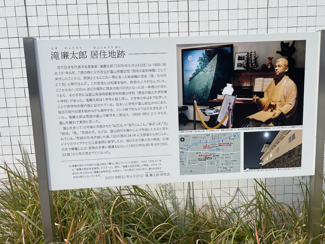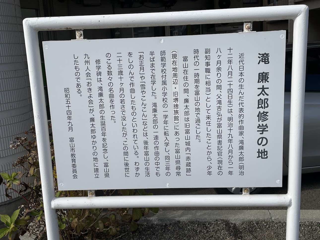 近代日本を代表する音楽家・滝廉太郎(1879年8月24日生)は、1886年(明治19)8月、7歳の時に父の吉広が富山県書記官(現在の副知事職)として来任したことから、家族とともにこの一帯にあった総曲輪の官舎(現・富山市丸の内2丁目)に移り住んだ。この官舎には知事を始め、幹部の人々が住んでいた。ここから北へ300mほどの場所に現在の松川の元となった旧・神通川が流れており、その手前には富山県尋常師範学校附属小学校(現在の富山大学附属小学校)があった。滝廉太郎は1学年に転入学し、3学年の半ばまで在学したことが修学地の案内板に記されている。住まいと学校が富山城址の中にあり、毎日石垣やお掘を眺めながら通学する、という城下町ならではの生活を送っていた。滝廉太郎は雪国の富山で新年を二度迎え、1888年(明治21年)5月、富山を離れて東京に戻った。富山を去って12年後に作曲された「お正月」や「雪やこんこん」「鳩ぽっぽ」「花」「納涼」「雪」「荒城の月」などは、富山時代を懐かしんで作曲したものと言われている。「荒城の月」を作曲した後、1901年(明治34年)に文部省から命じられ、ドイツのライプチヒ王立音楽院に留学したが、病にかかり数ヶ月で帰国。父母の元で療養したが、家族の手厚い看護もむなしく、1903年(明治36年)6月29日、23歳10ヶ月の若さで亡くなった。 2023年(令和5年)6月29日 滝 廉太郎 研究会